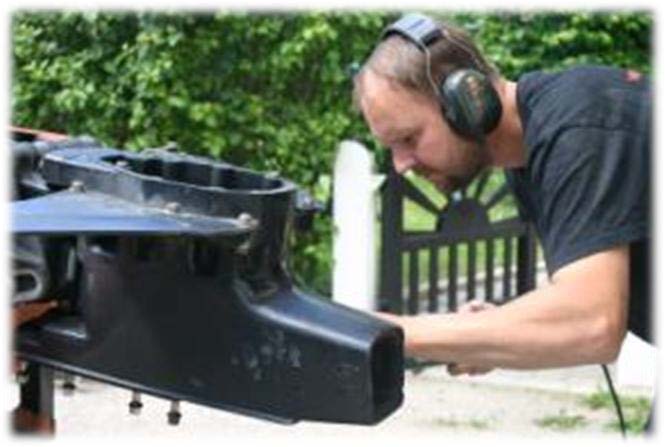 Vi har lite olika saker att testa. Kes vill att vi kollar en del saker i båtens ”set up” som vi inte har testat tidigare. Vi återkommer med resultat senare. I samband med tävlingen i Kaunas gick ett propellerblad av och slog upp en spricka i riggen/avgasröret. Vi genomförde tävlingen med den spruckna riggen. Det finns alltid en risk att en spricka fortsätter när man kör motorn och en massa vibrationer tas upp av riggen. Den här gången gick det bra men sprickan måste lagas innan vi kör motorn mera. Därför ringde jag Patrik på PP Teknik och frågade om han kunde svetsa riggen. Alla som kan något om svetsning av aluminium vet att det är något av det svåraste man kan ge sig på. Patriks svar var ”Inga problem, kom över med grejerna”. I det här fallet sitter riggen kvar på båten så man måste svetsa underifrån och uppåt. Det gör det hela ändå svårare.