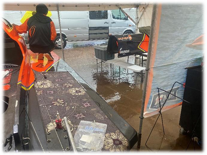 När vi kom till depån på söndag morgon så var vårt tält översvämmat av ett åskregn som gick över depån på natten.