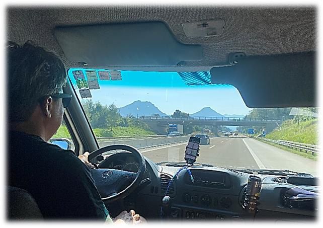 Resan ned i torsdags var 220 mil och tog 36 timmar p.g.a. diverse vägavstängningar både i Sverige och nere i Europa. Vi tappade nog också några timmar när vi skulle ta oss över Dollomiterna som skymtar en bit framför oss.