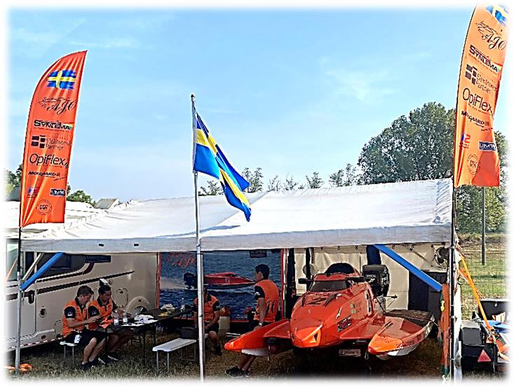 Allt ni ser på bilderna som är gjort av textil såsom alla flaggor, teamkläder och vepan mitt i tältet är tillverkat av Elek Kosma som äger och driver ett företag i Ungern som heter ”PRO SPORT-APPAREL” de har specialiserat sig på promotion-kläder och andra produkter inom reklam. På högra bilden ser ni Elek ”skjuta på” Johans båt. Om ert företag behöver promotion utrustning och vill ha kontakt med Elek så är det bara att lägga till .com i företagsnamnet ovan så har ni hela webbadressen.