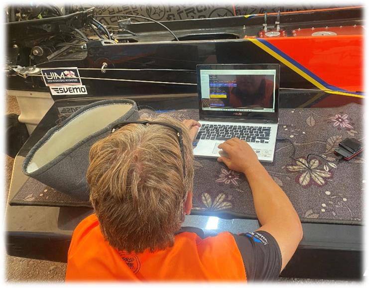 Efter kvalet läser Johan av en massa lagrade data för att se om han kan ändra något i sin körning ex.vis ändra spårvalen i kurvorna, gasa lite längre in i kurvorna eller komma på gasen lite tidigare ut ur kurvorna. Allt sådant kan han läsa ut ur de loggar som har sparats i båtens elektronikutrustning.