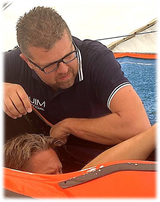 Vi hade som vanligt inga större problem med det. Tekniska chefen Luca Basilico kontrollerar att allt fungerar i Johans cockpit